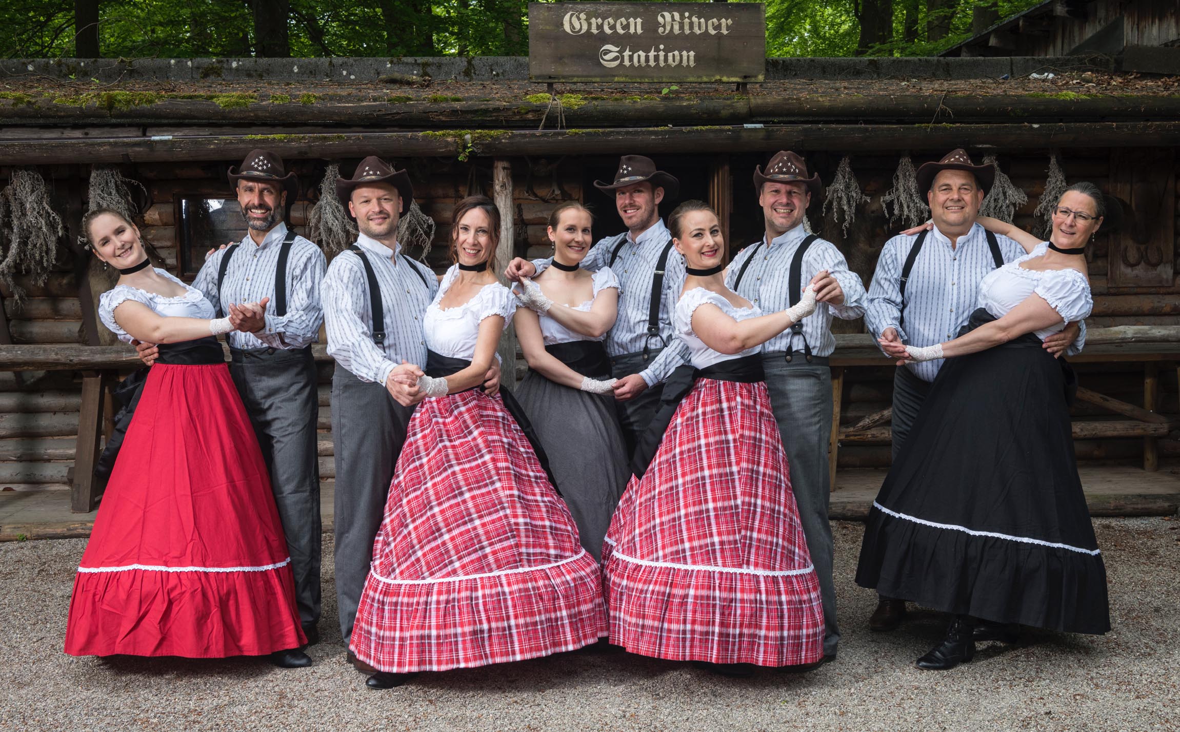 Wir haben den Two Step, die Polka und den Nightclub Two Step ausgewählt und in eine Tanzformation gepackt. Zum Motto passend tragen wir dazu Oldstyle-Kleidung.